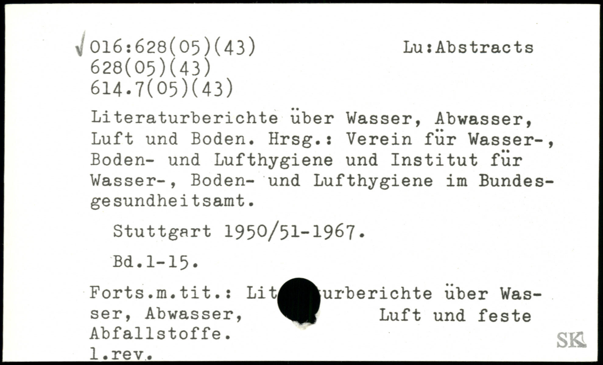 Literaturberichte über Wasser, Abwasser, Luft und Boden. Hrsg.: Verein für Wasser-, Boden- und Lufthygiene und Institut für Wasser-, Boden- und Lufthygiene im Bundesgesundheitsamt.
