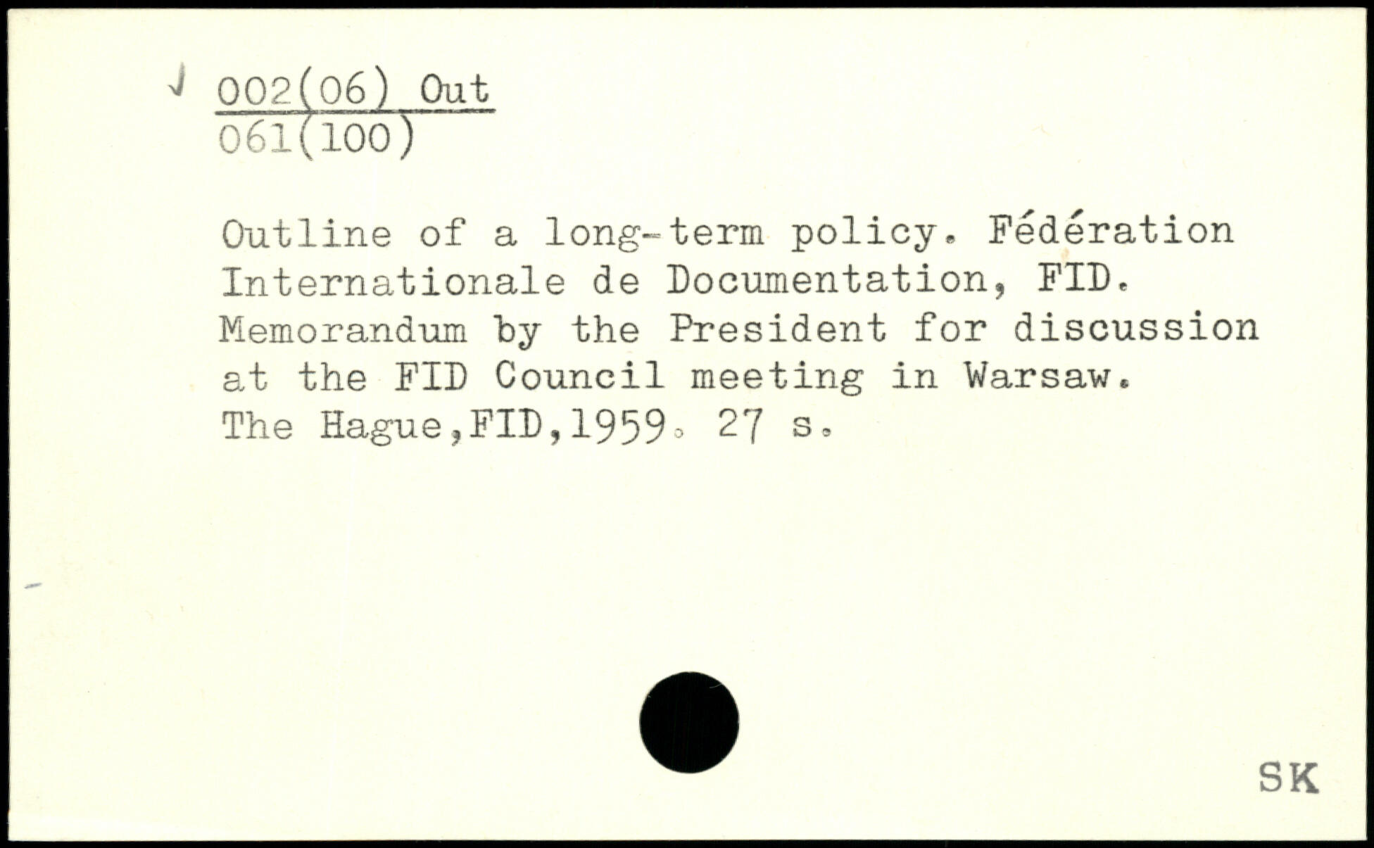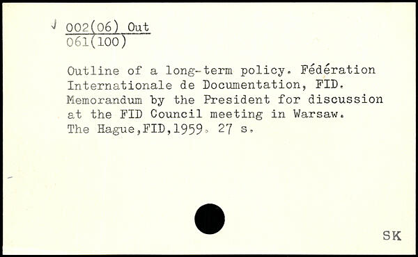 Outline of a long-term policy. Fédération Internationale de Documentation, FID. Memorandum by the President for discussion at the FID Council meeting in Warsaw.