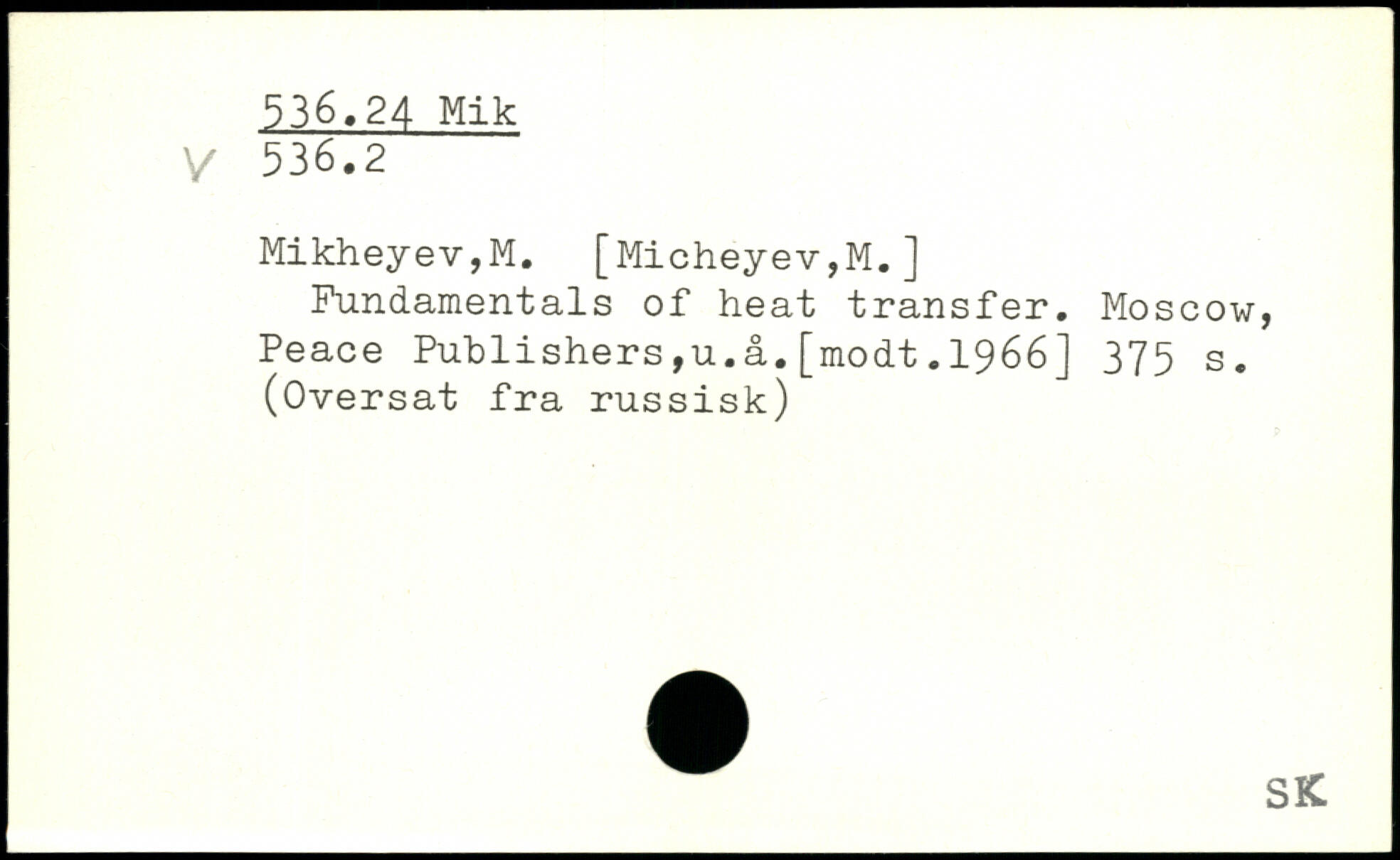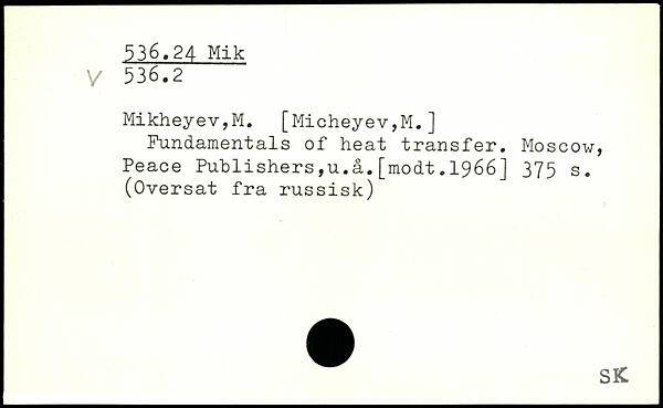 Mikheyev,M. [Micheyev,M.] Fundamentals of heat transfer. Moscow, Peace Publishers,u.å.[modt.1966]