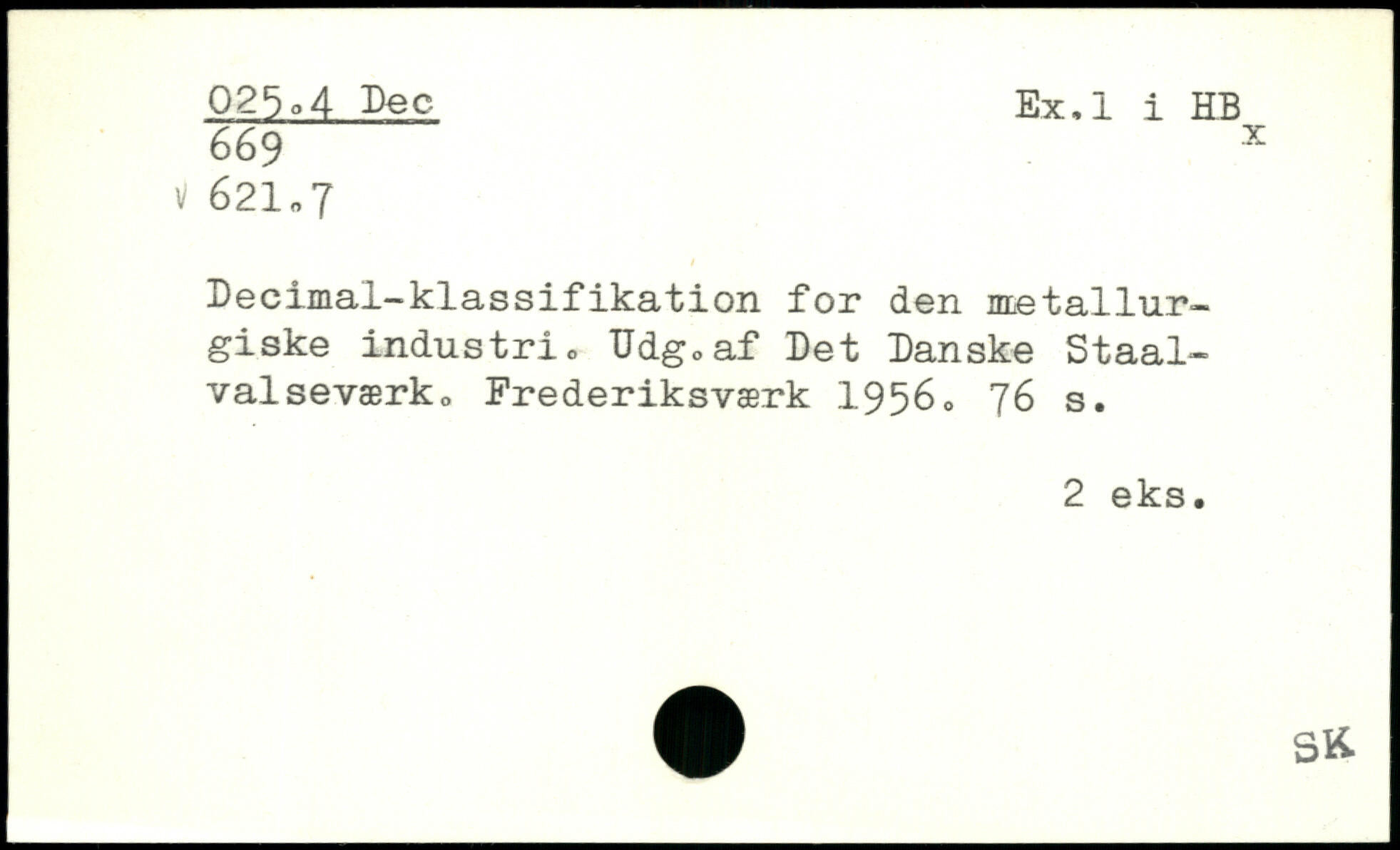 Decimal-klassifikation for den ntetallur-giske industrie Udg,af Det Danske Staal-valseværk, Frederiksværk 19560