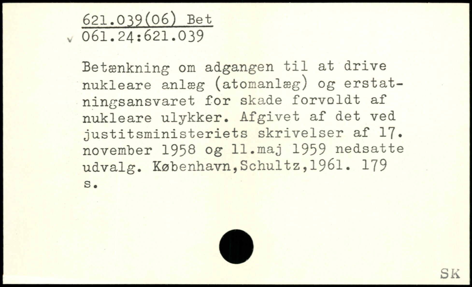 Betænkning om adgangen til at drive nukleare anlæg (atomanlæg) og erstatningsansvaret for skade forvoldt af nukleare ulykker. Afgivet af det ved justitsministeriets skrivelser af 17, november 1958 og 11.maj 1959 nedsatte udvalg.