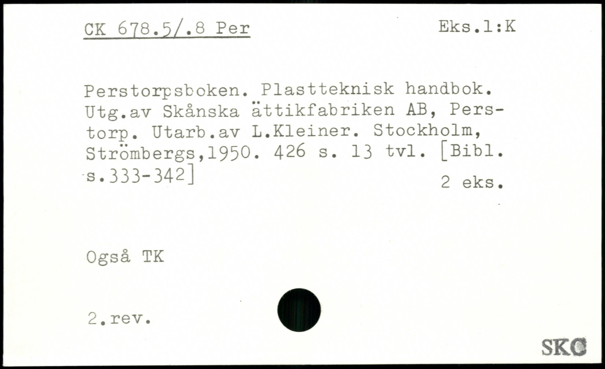 Perstorpsboken. Plastteknisk handbok. Utg.av Skånska ättikfabriken AB, Perstorp. Utarb.av L.Kleiner.