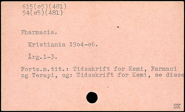 Kristiania 19o4-o6. Årg.1-3. Ports.m.tit.: Tidsskrift for Kemi, Farmaci og Terapi, og: Tidsskrift for Kemi, se disse