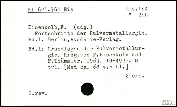 Fortschritte der Pulvermetallurgie. Bd.l. Berlin,Akademie-Verlag. Bd.lt Grundlagen der Pulvermetallurgie. Hrsg.von F.Eisenkolb und F.Thümmler. 1963. 19+492s. 8 tvl. [Med ca.