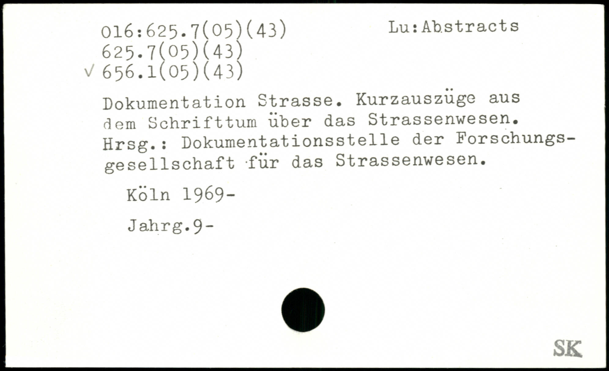 Dokumentation Strasse. Kurzauszüge aus dem Schrifttum über das Strassenwesen. Hrsg.: Dokumentationsstelle der Forschungs gesellschaft für das Strassenwesen.