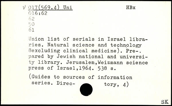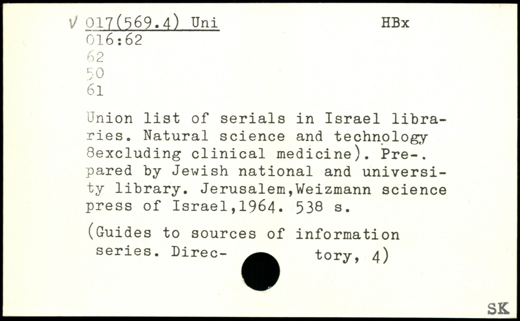 Union list of serials in Israel libraries. Natural science and technology 8excluding clinical medicine). Pre-. pared by Jewish national and university library. Jerusalem,Veizmann science press of Israel,1964.