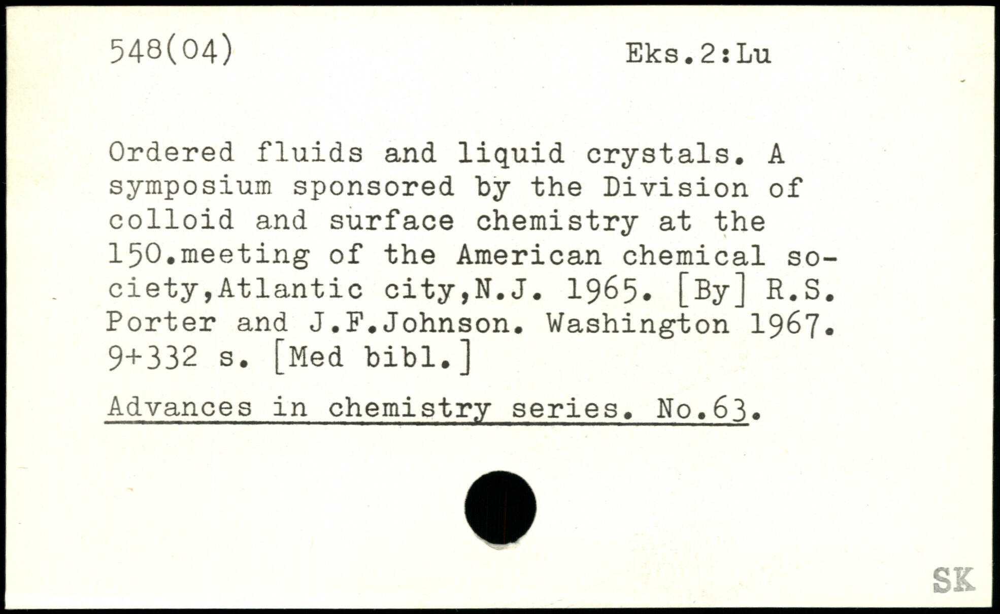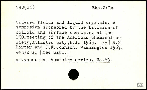 Ordered fluids and liquid crystals. A symposium sponsored by the Division of colloid and surface chemistry at the 150.meeting of the American chemical society , Atlantic city,N.J. 1965. [By] R.S. Porter and J.F.Johnson.
