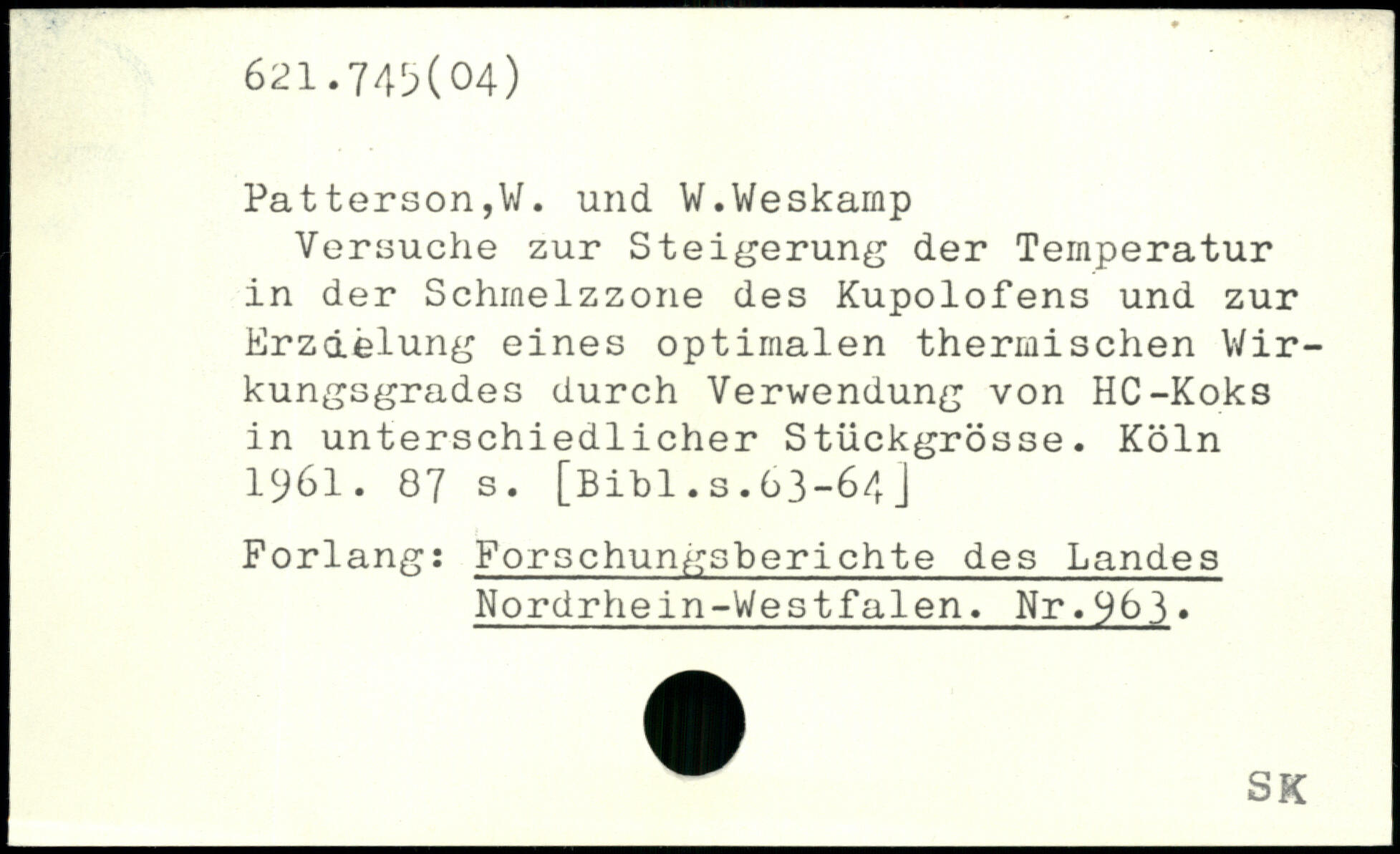 Patterson,V/. und W.Weskarnp j Versuche zur Steigerung der Temperatur in der Schmelzzone des Kupolofens und zur Erzielung eines optimalen thermischen Wirkungsgrades durch Verwendung von HC-Koks in unterschiedlicher Stückgrösse.