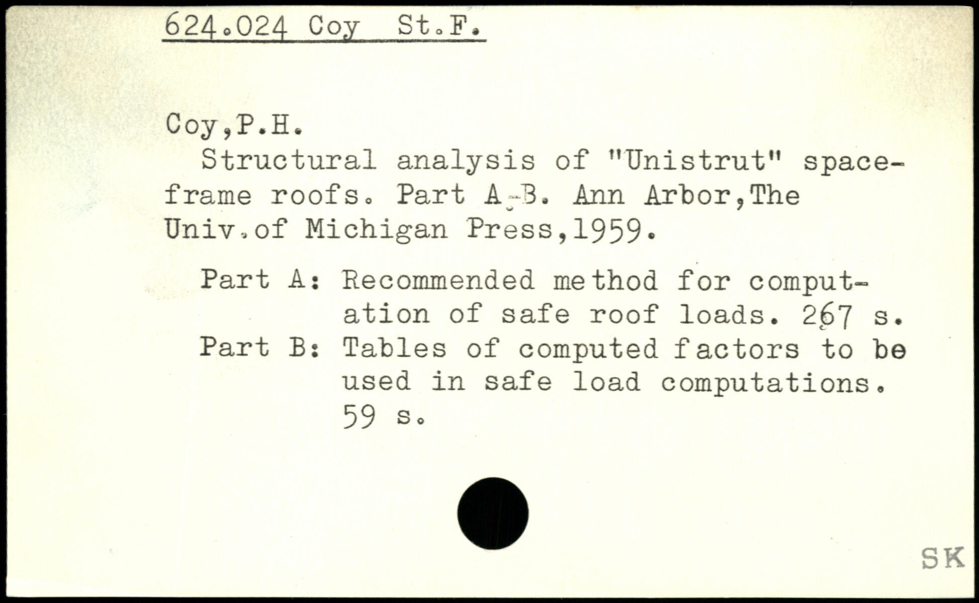 Structural analysis of "Unistrut" space-frame roofs, Part A-B. Ann Arbor,The Univ.of Michigan Press,1959, Part A: Recommended method for computation of safe roof loads. 2^