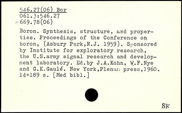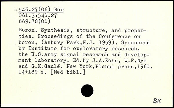 Boron. Synthesis, structure, and properties. Proceedings of the Conference on boron, (Asbury Park,N.J. 1959). Sponsored by Institute for exploratory research, the U.S.army signal research and development laboratory. Ed.by J.A.Kohn, W.F.Nye and G.K.Gaulé.