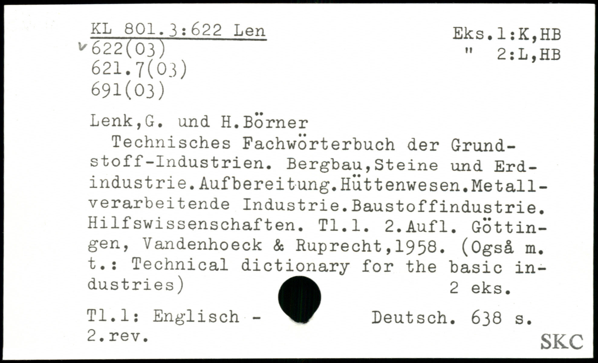 Technisches Fachwörterbuch der Grundstoff-Industrien. Bergbau,Steine und Erdindustrie. Aufbereitung. HÜttenwesen.Metall-verarbeitende Industrie.Baustoffindustrie. Hilfswissenschaften. Tl.l.