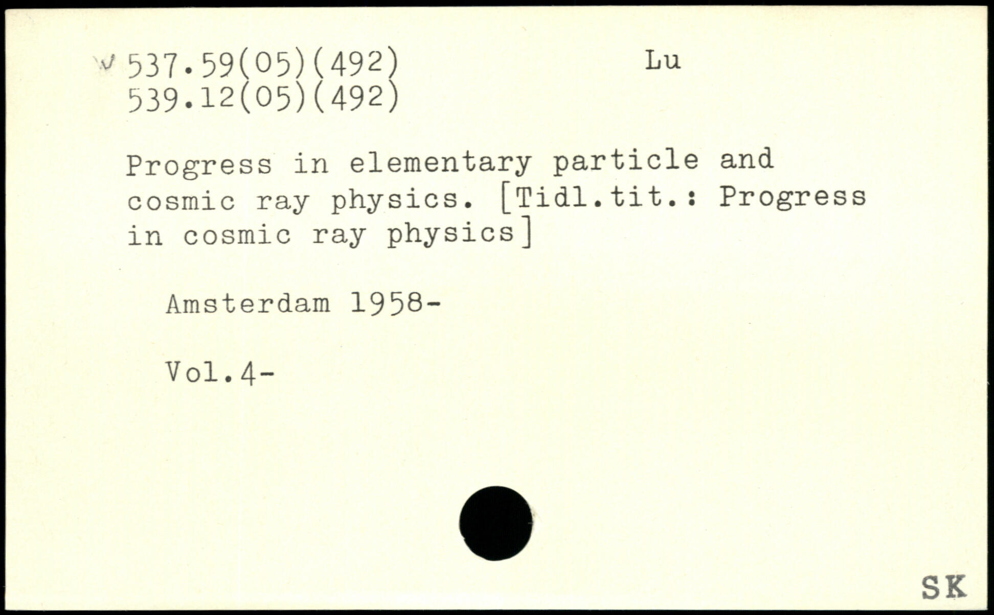 Progress in elementary particle and cosmic ray physics. [Tidl.tit.: Progress in cosmic ray physics] Amsterdam 1958-