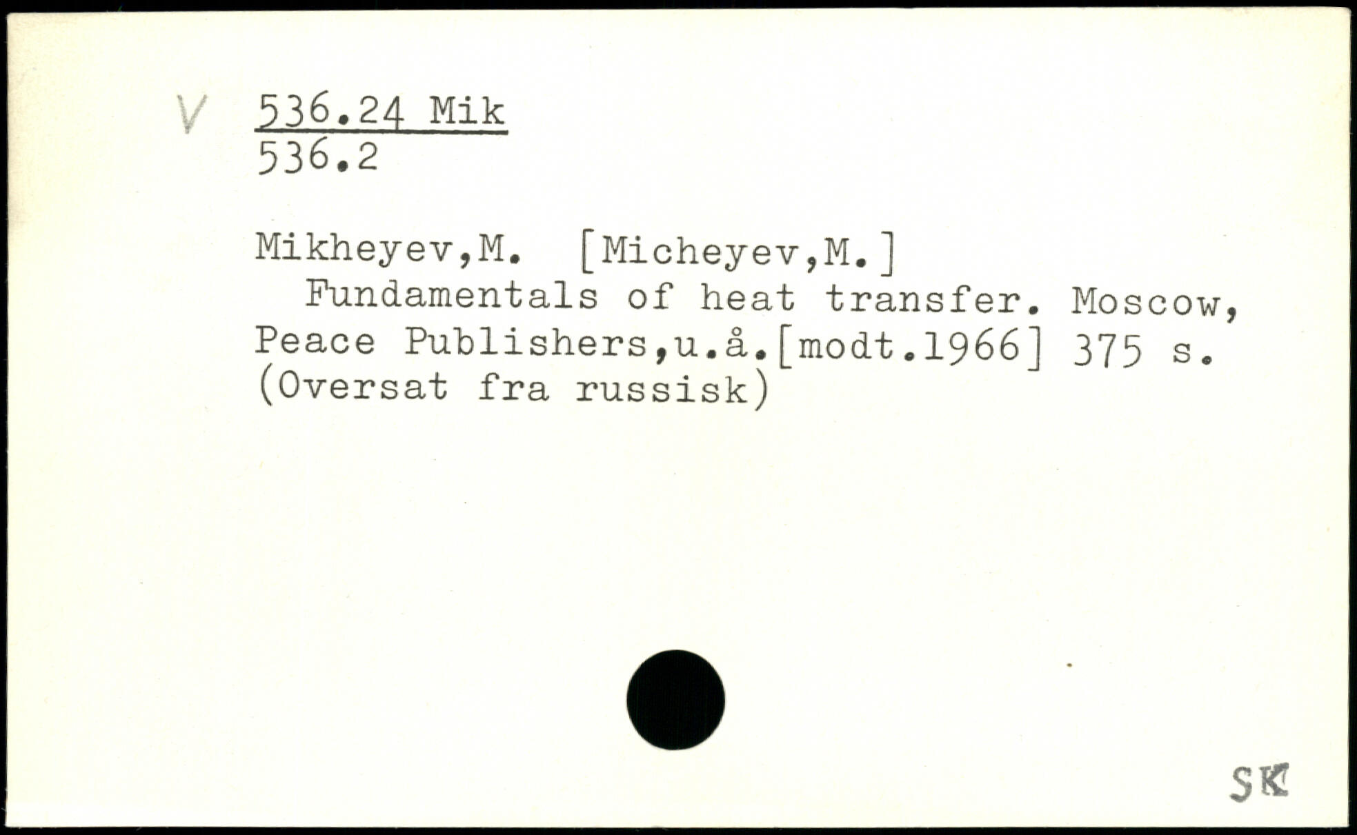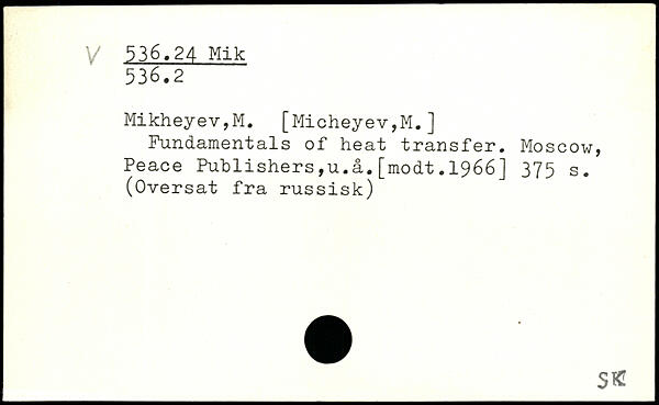 Mikheyev,M. [Micheyev,M.] Fundamentals of heat transfer. Moscow, Peace Publishers,u.å.[modt.1966]