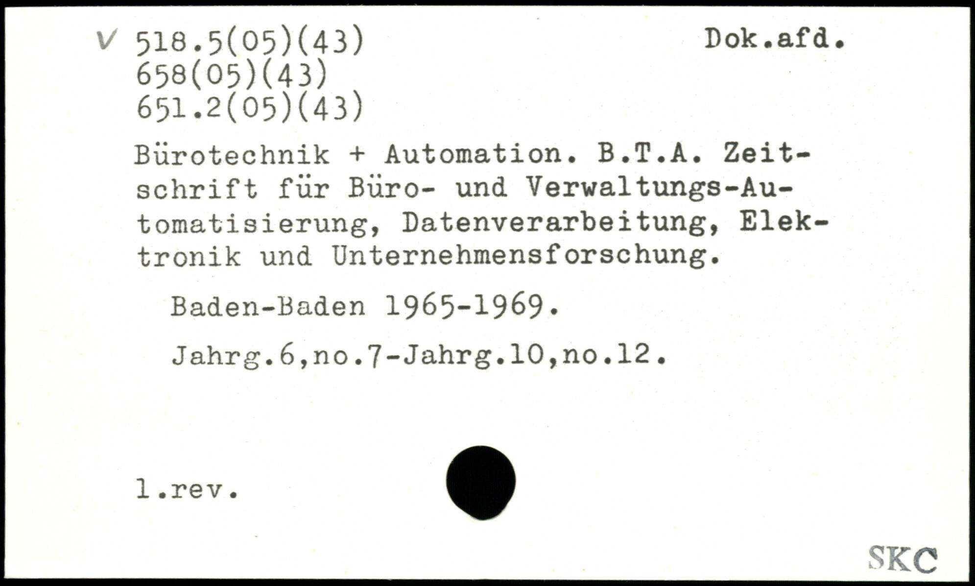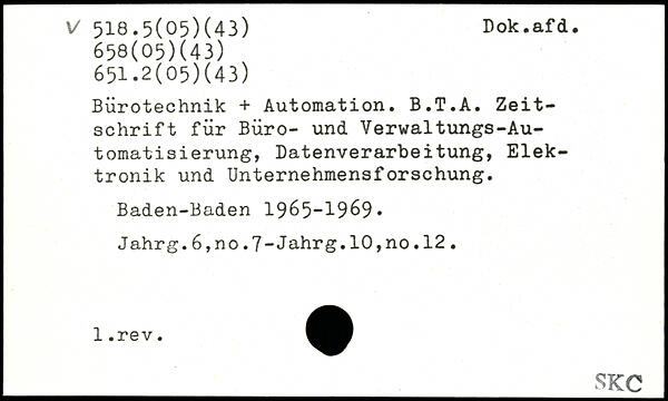 Bürotechnik + Automation. B.T.A. Zeitschrift für Büro- und Verwaltungs-Automatisierung, Datenverarbeitung, Elektronik und Unternehmensforschung. Baden-Baden 1965-1969. Jahrg.6,no.7-J&hrg.lO,no.l2.