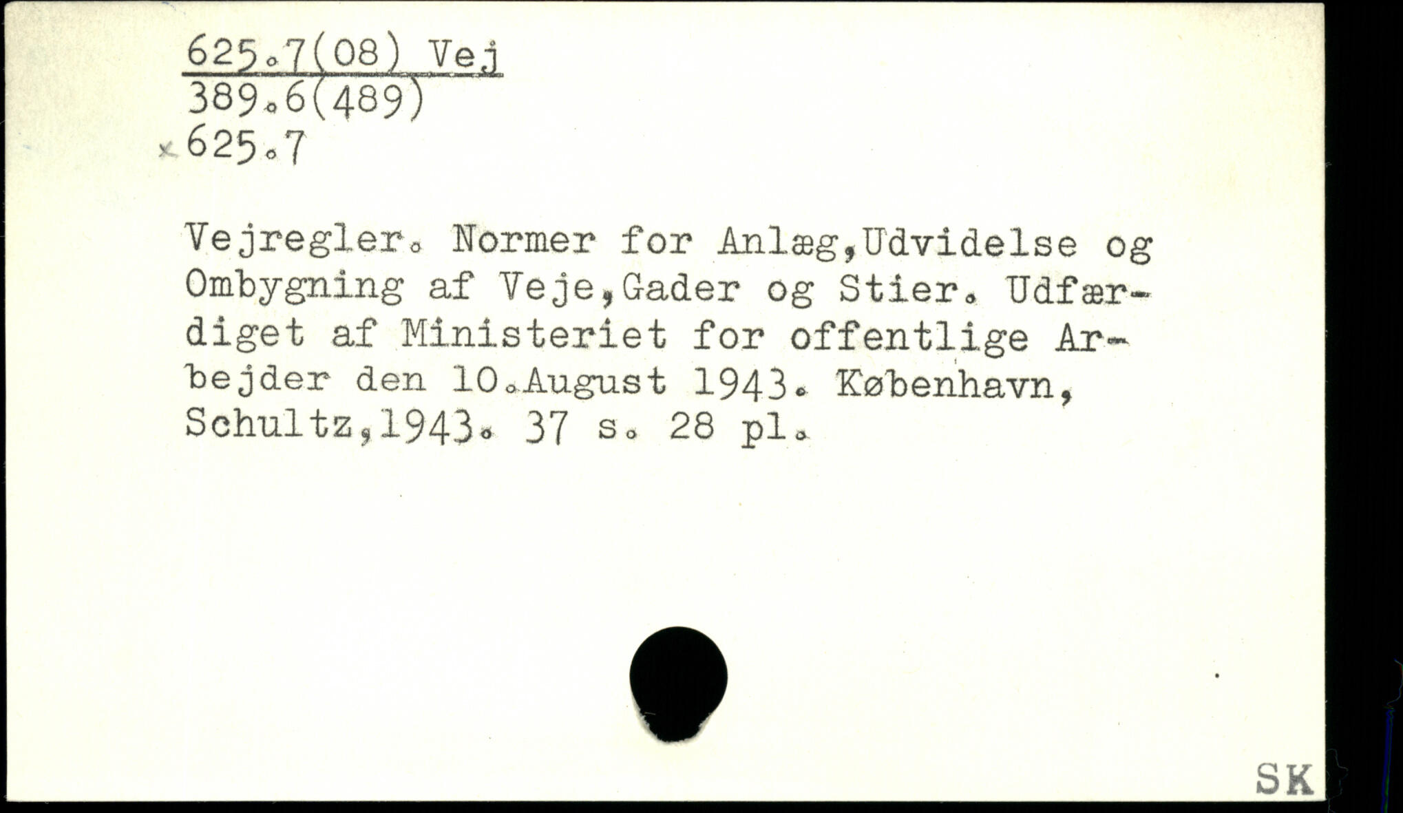 Vejreglero Normer for Anlæg,Udvidelse og Ombygning af Veje,Gader og Stier, Udfær-diget af Ministeriet for offentlige Ar-bejder den 10,August 1943