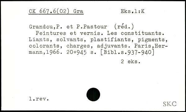 Grandou,P. et P.Pastour (réd.) Peintures et vernis. Les constituants. Liants, solvants, plastifiants, pigments, colorants, charges, adjuvants.