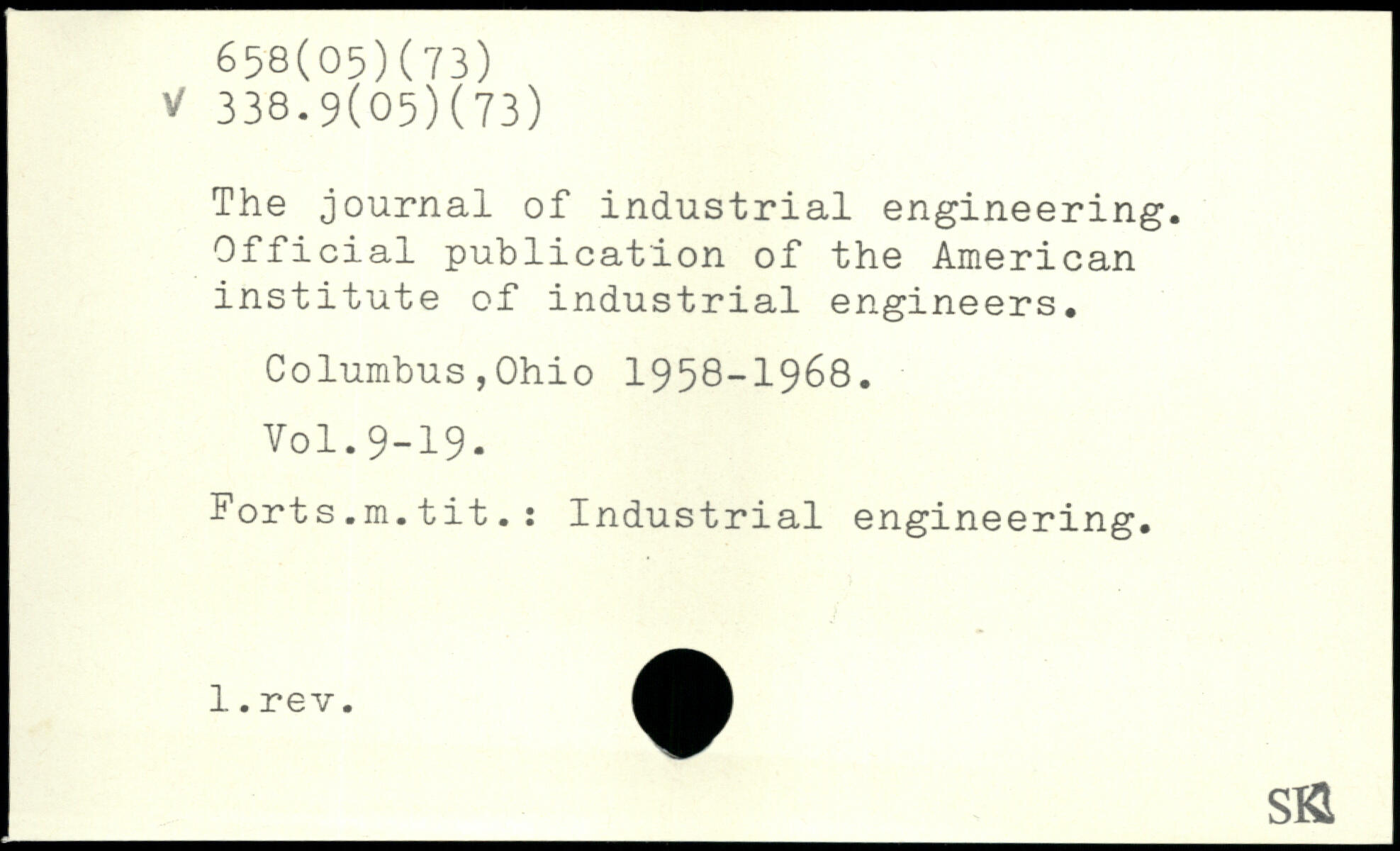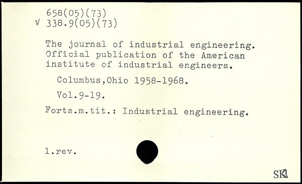 The journal of industrial engineering. Official publication of the American institute of industrial engineers. Columbus,Ohio 1958-1968. Forts.m.tit.: Industrial engineering. _