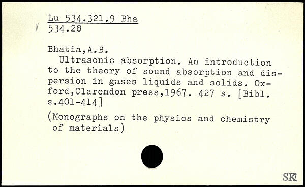 Ultrasonic absorption. An introduction to the theory of sound absorption and dispersion in gases liquids and solids.