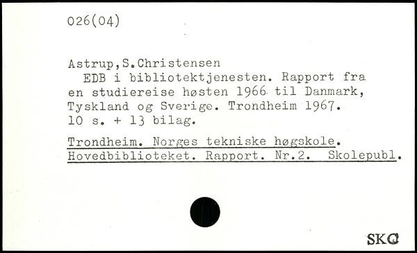 Astrup,S.Christensen EDB i bibliotektjenesten. Rapport fra en studiereise høsten 1966 til Danmark, Tyskland og Sverige.