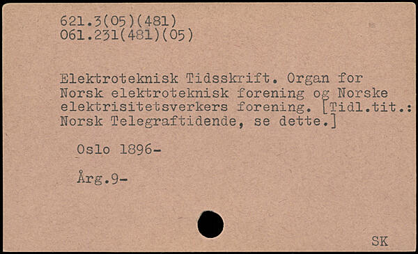 Elektroteknisk Tidsskrift. Organ for Norsk elektroteknisk forening og Norske elektrisitetsverkers forening. [Tidl.tit.: Norsk Telegraftidende, se dette.] Oslo 1896- Årg.9-