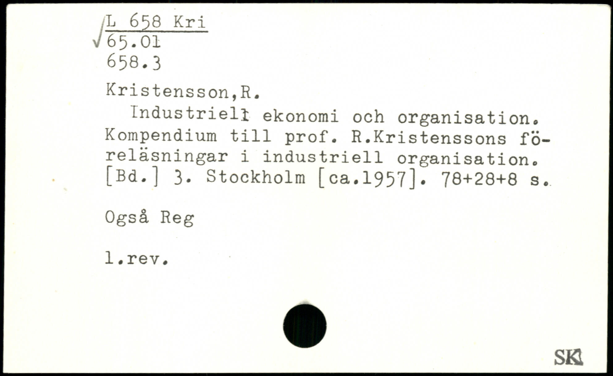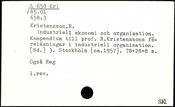 Industriell ekonomi och organisation. Kompendium till prof. R.Kristenssons föreläsningar i industriell organisation. [Bd.] 3. Stockholm [ca.1957]