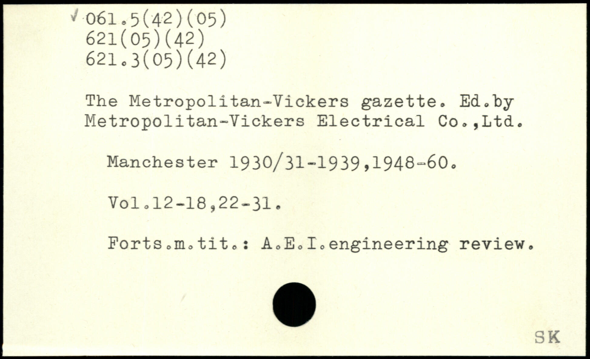 The Metropolitan-Yickers gazette. Ed.by Metropolitan-Vickers Electrical Co,,Ltd.