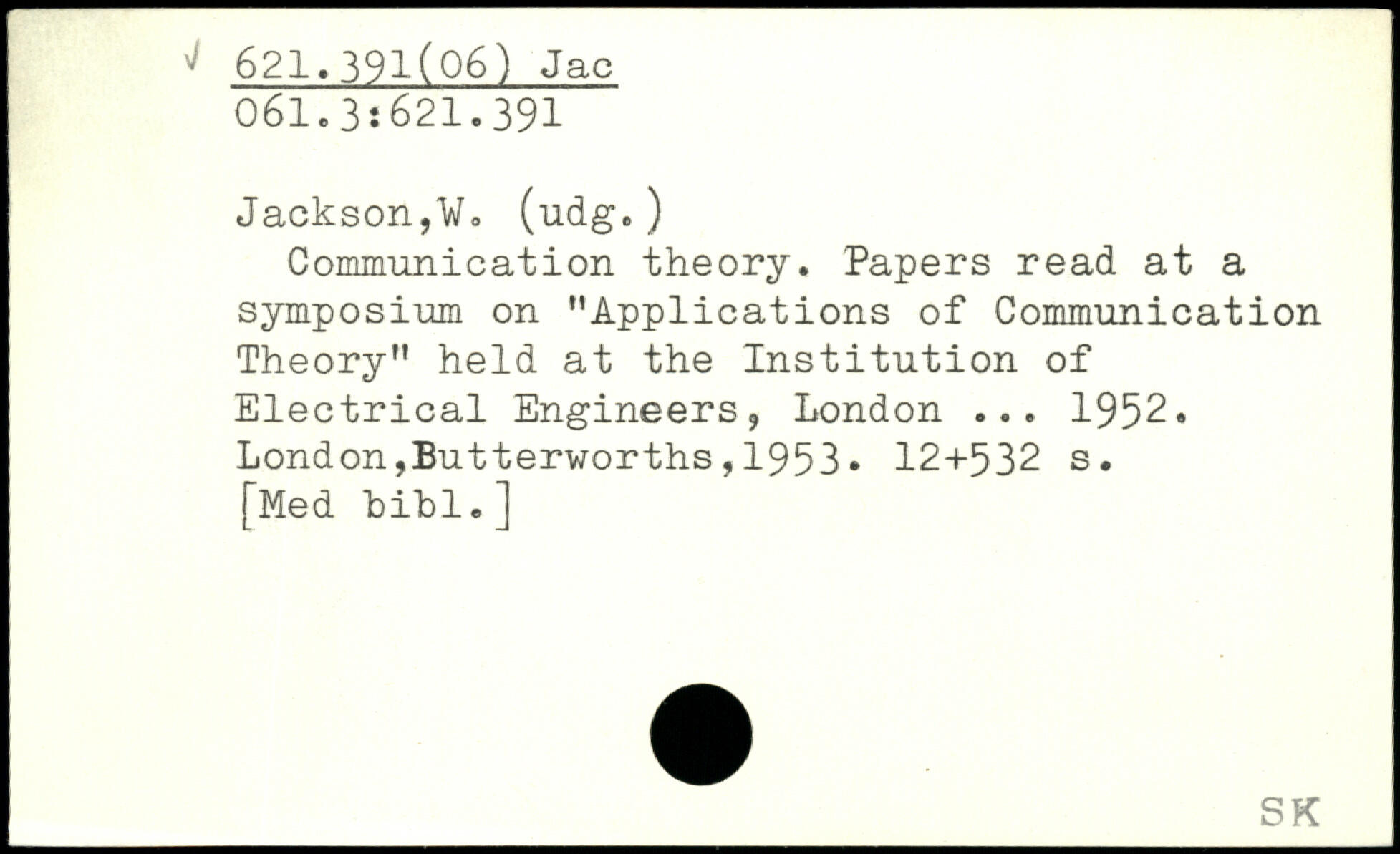 Communication theory. Papers read at a symposium on ''Applications of Communication Theory" held at the Institution of Electrical Engineers, London ... 1952.