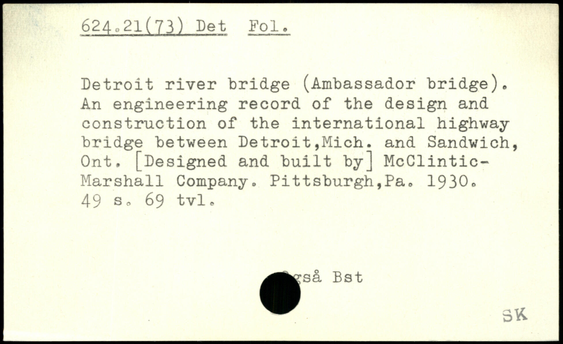 Detroit river bridge (Ambassador bridge). An engineering record of the design and construction of the international highway-bridge between Detroit,Mich. and Sandwich, Ont. [Designed and built by]