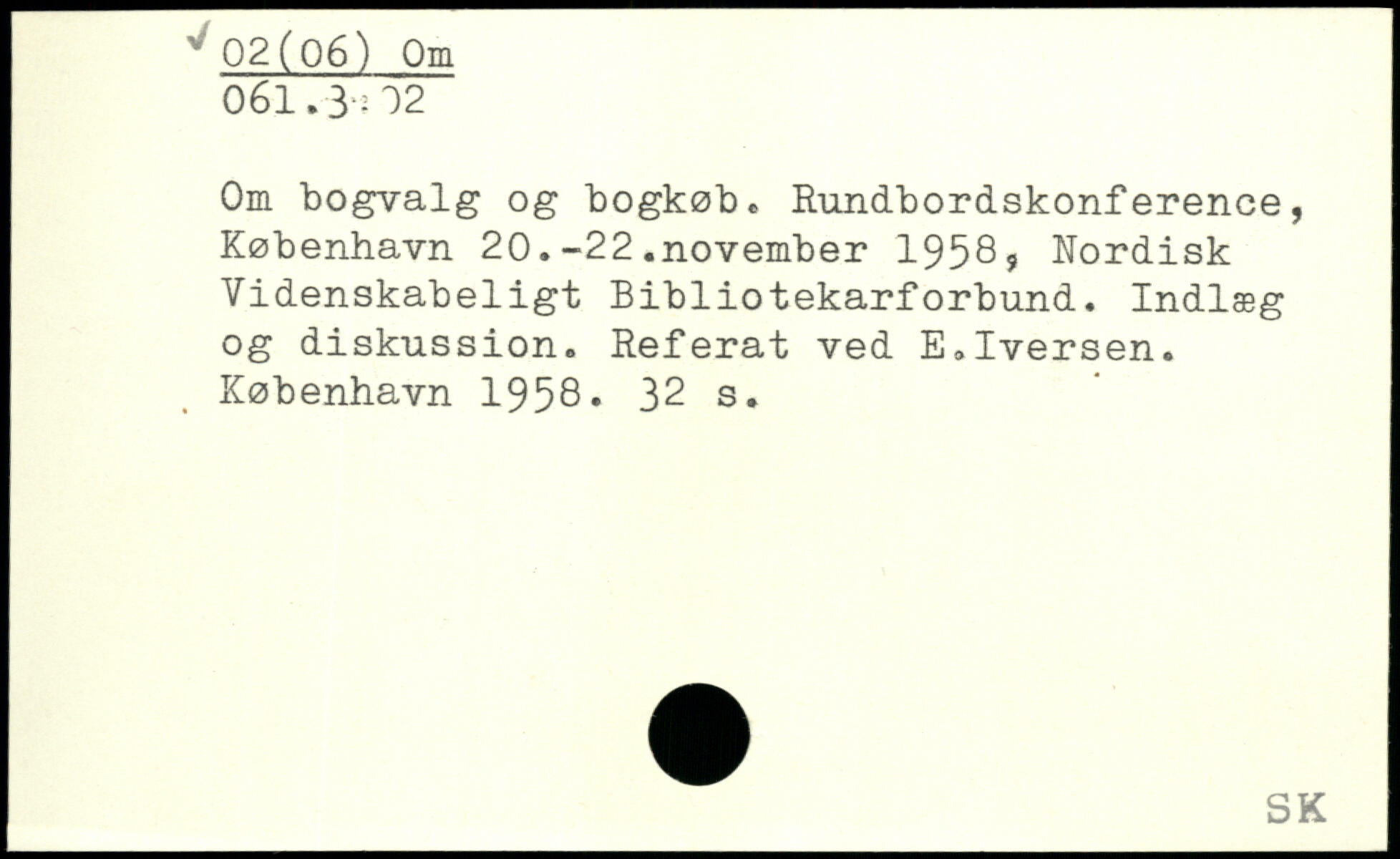 Om bogvalg og bogkøb. Rundbordskonference, København 20.-22.november 1958? Nordisk Videnskabeligt Bibliotekarforbund. Indlæg og diskussion. Referat ved E.Iversen.