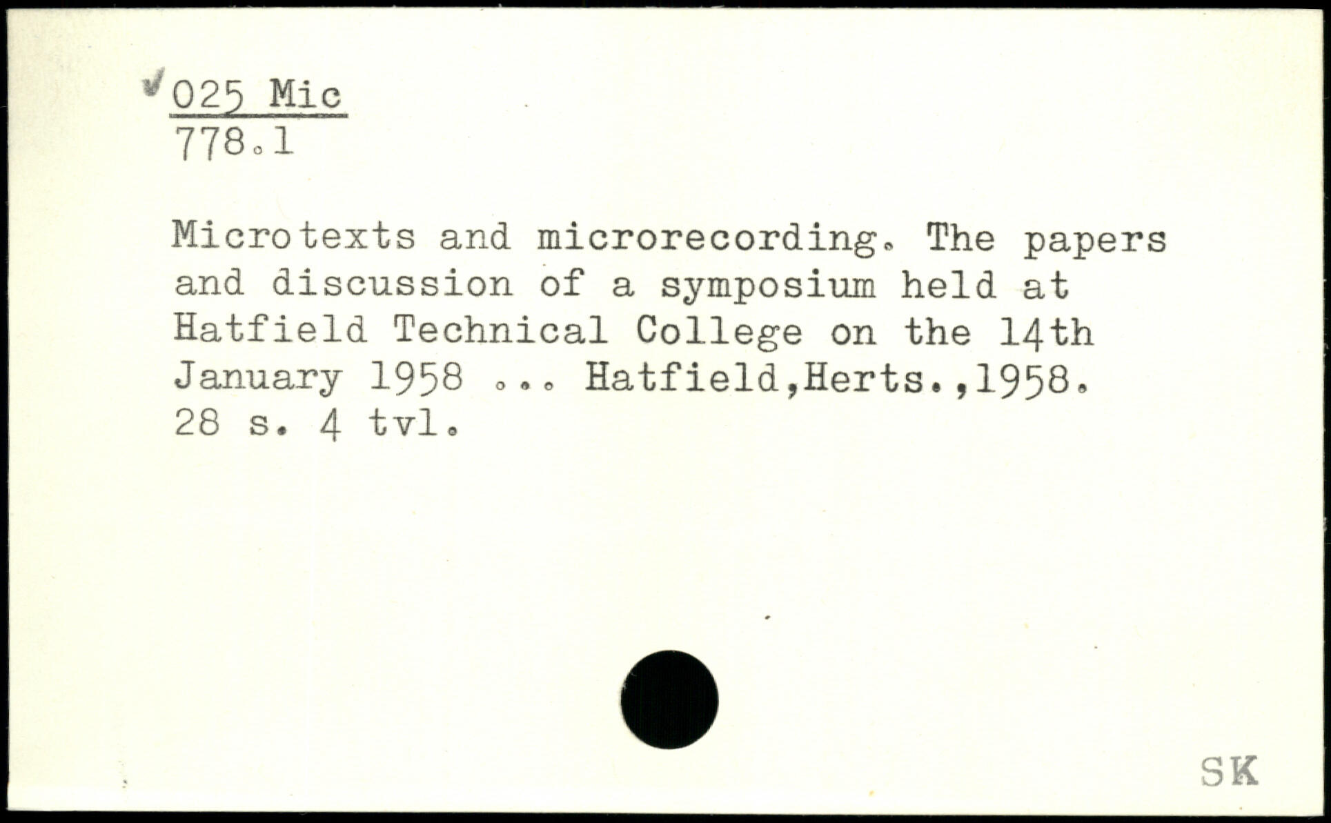 Micro texts and microrecording. The papers and discussion of a symposium held at Hatfield Technical College on the 14th January 1958 ,.