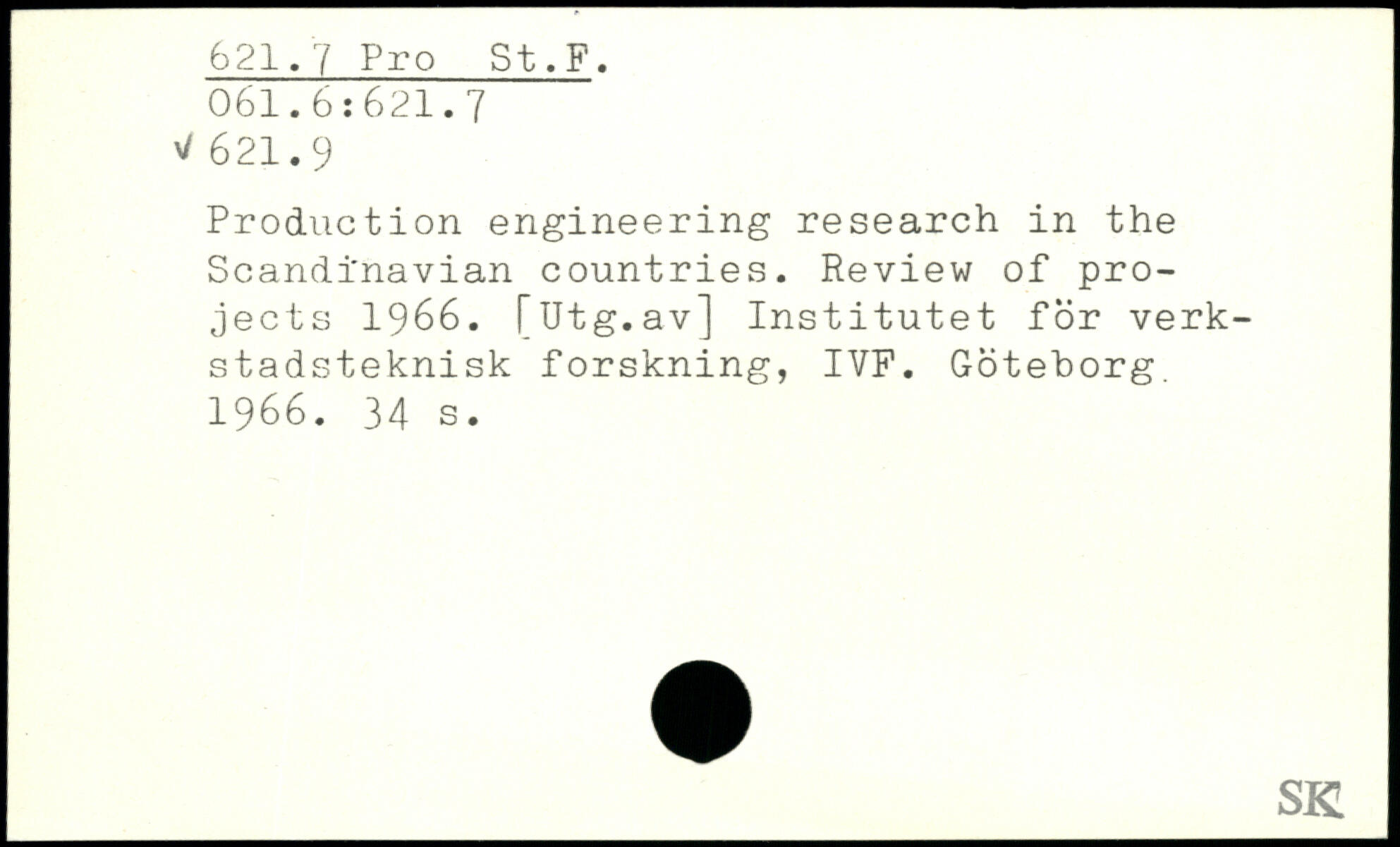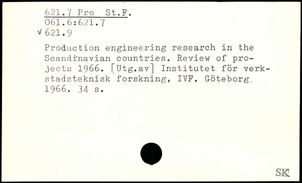 Production engineering research in the Scandinavian countries. Review of projects 1966. [Utg.av] Institutet for verk-stadsteknisk forskning, IVF. Göteborg. 1966.
