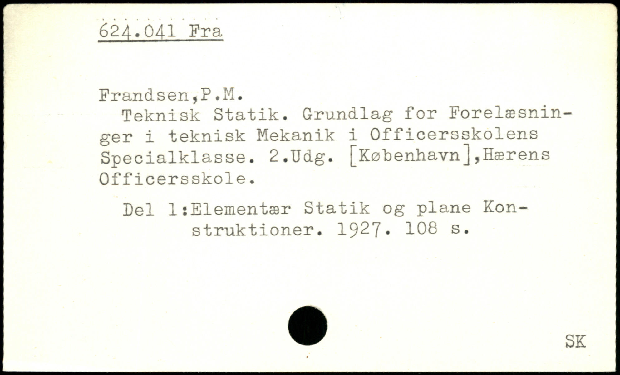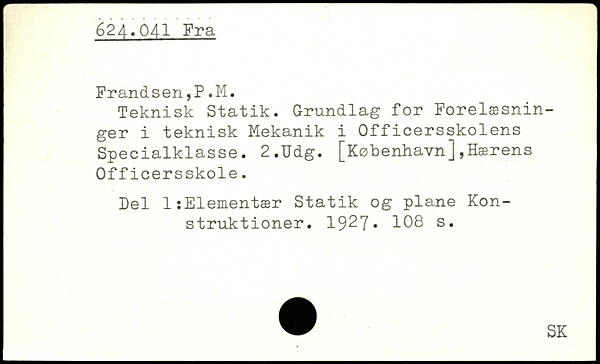 Teknisk Statik. Grundlag for Forelæsninger i teknisk Mekanik i Officersskolens Specialklasse. 2.Udg. [København],Hærens Officersskole. Del IsElementær Statik og plane Konstruktioner. 1927.