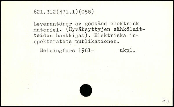 Leverantörer av godkänd elektrisk materiel. (Hyväksyttyjen sähkölait-teiden hankkijat). Elektriska inspektoratets publikationer.