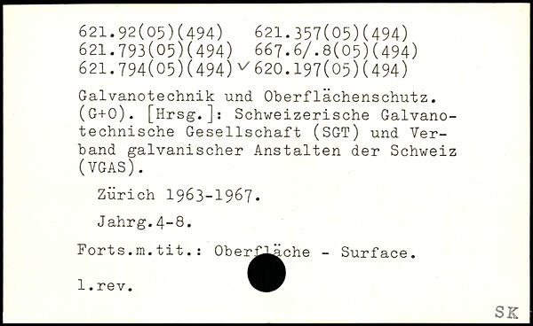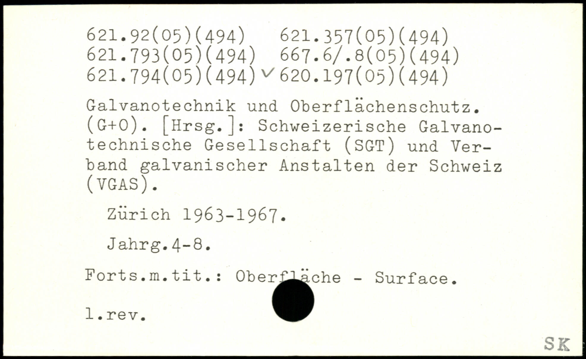 Galvanotechnik und Oberflächenschutz. (G+O). [Hrsg.]: Schweizerische Galvanotechnische Gesellschaft (SGT) und Verband galvanischer Anstalten der Schweiz (VGAS). Zürich 1963-1967. Jahrg.4-8. Forts.m.tit. : Ober^^che - Surface. l.rev.