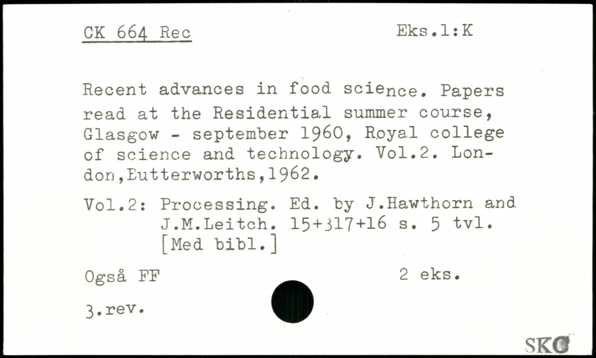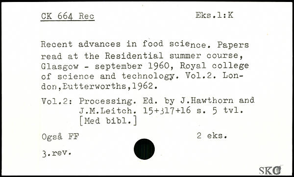 Recent advances in food science. Papers read at the Residential summer course, Glasgow - September 1960, Royal college of science and technology.
