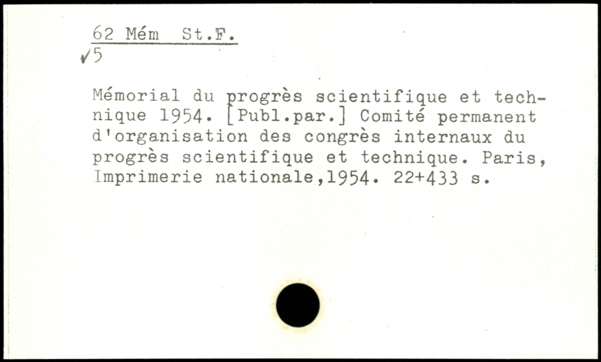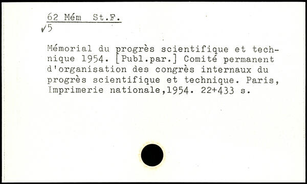 Mémorial du progrès scientifique et technique 1954. [Publ.par.] Comité permanent d’organisation des congrès internaux du progrès scientifique et technique.
