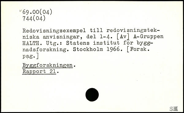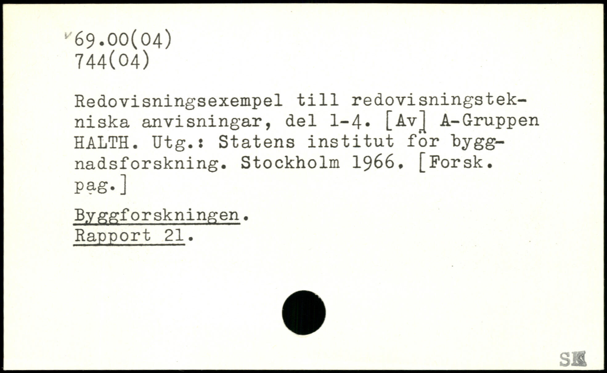 Redovisningsexempel till redovisningstek-niska anvisningar, del 1-4. [Av] A-Gruppen HALTH. Utg.: Statens institut for byggnadsforskning.