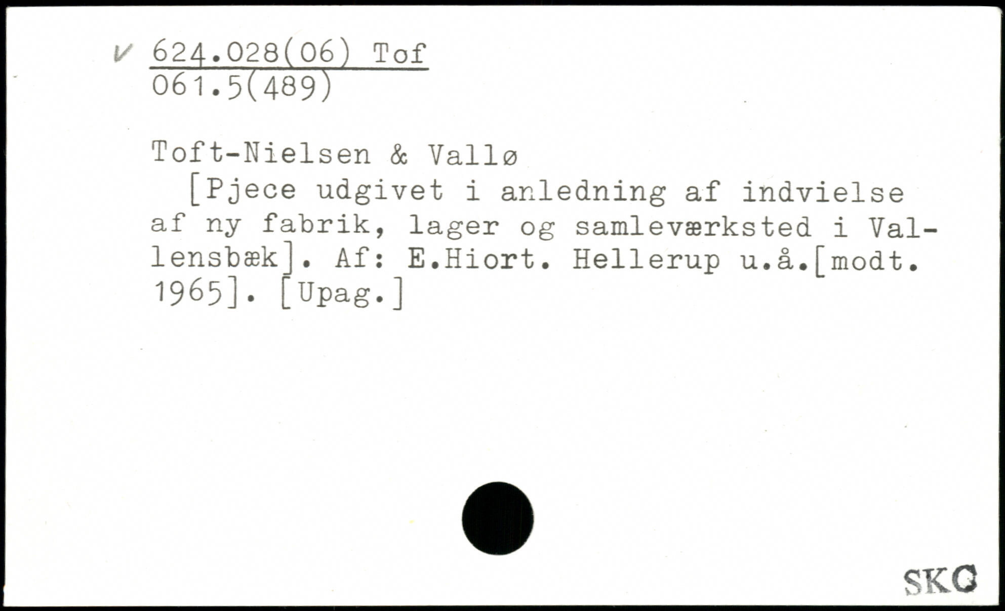 [Pjece udgivet i anledning af indvielse af ny fabrik, lager og samleværksted i Vallensbæk]. Af: E.Hiort. Hellerup u.å.[modt. 1965].