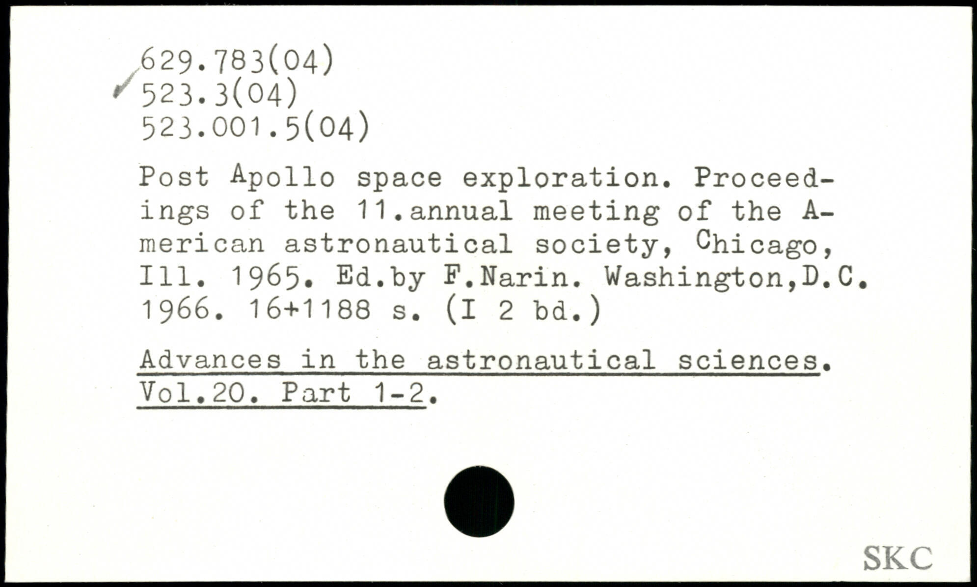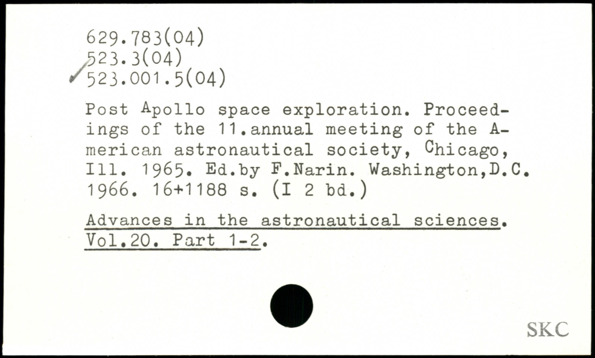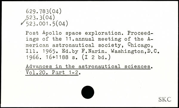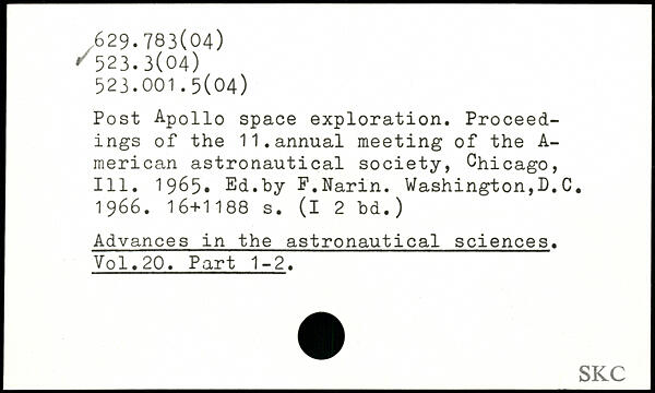 Post Apollo space exploration. Proceedings of the 11.annual meeting of the A-merican astronautical society, Chicago, 111. 1965, Ed.by F.Narin. Washington,D.C, 1966.