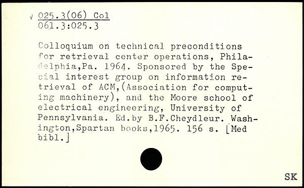 Colloquium on technical preconditions tor retrieval center operations, Philadelphia,Pa. 1964. Sponsored by the Special interest group on information retrieval of ACM,(Association for computing machinery), and the Moore school of electrical engineering, University of Pennsylvania. Ed.by B.F.Cheydleur.