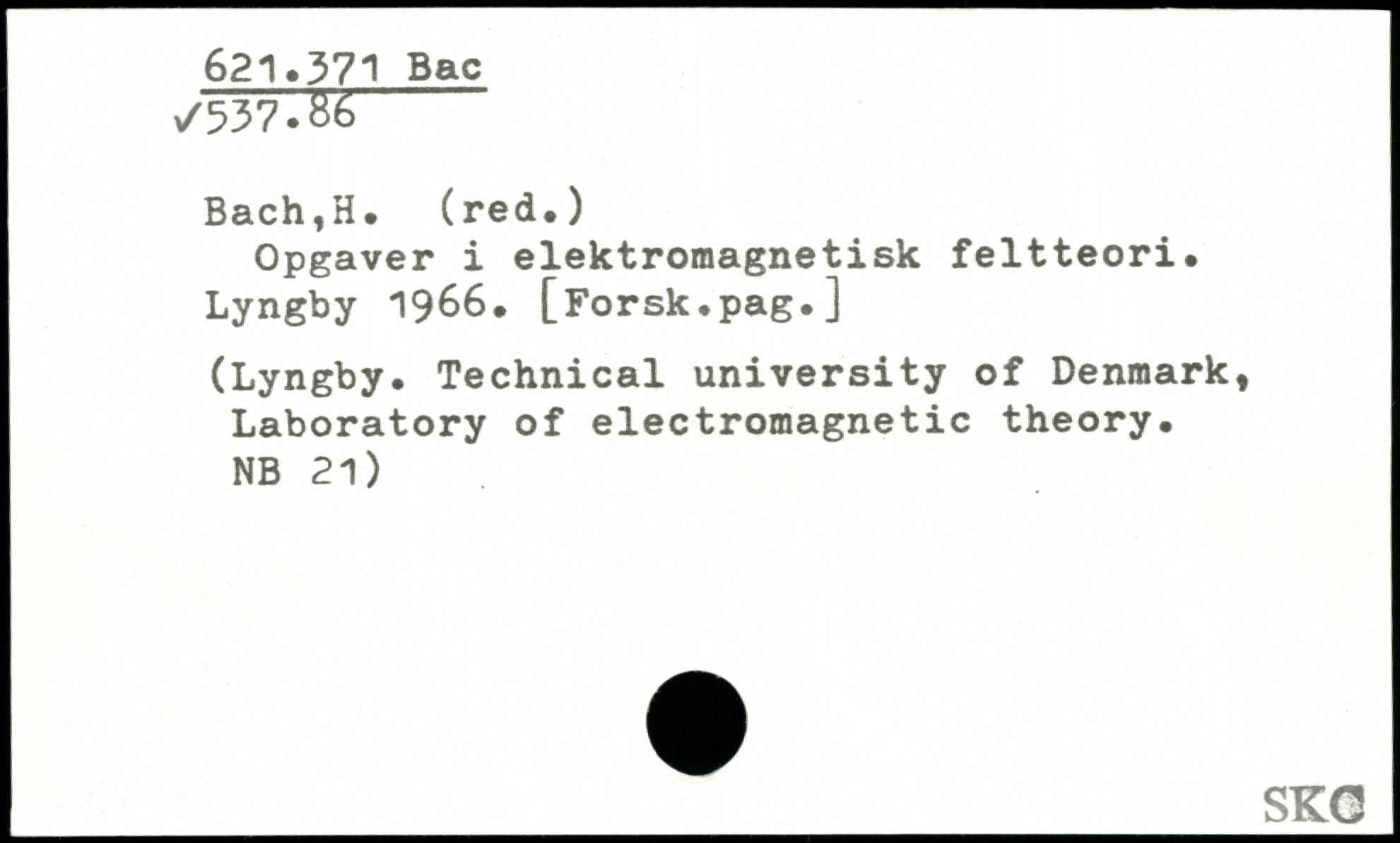 Opgaver i elektromagnetisk feltteori. Lyngby 1966. [Forsk.pag.] (Lyngby. Technical university of Denmark, Laboratory of electromagnetic theory. NB 21)