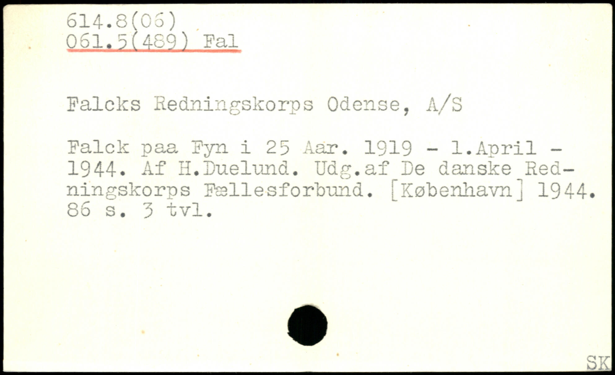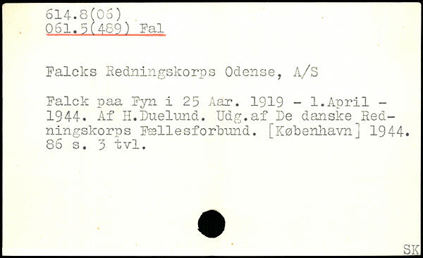 Falcks Redningskorps Odense, A/S Falck paa Fyn i 25 Aar. 1919 - 1.April -1944. Af H.Duelund. Udg.af De danske Redningskorps Fællesforbimd.