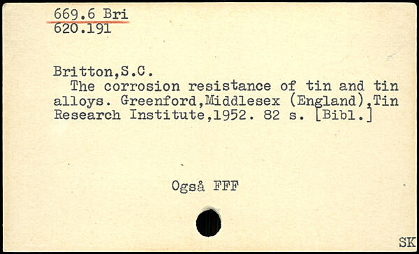 The corrosion resistance of tin and tin alloys. Greenford,Middlesex (England).Tin Research Institute,1952.