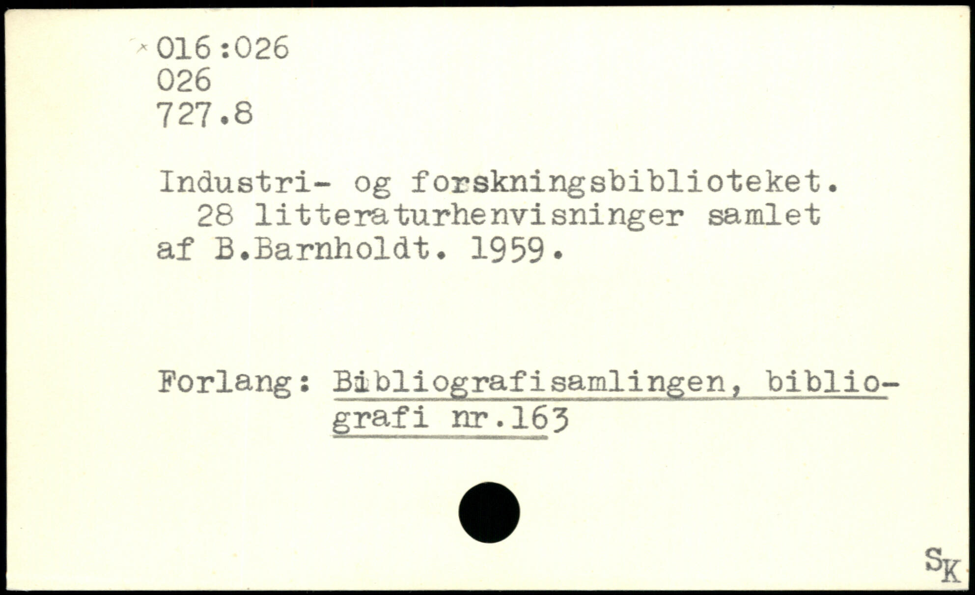 Industri- og forskningsbiblioteket. 28 litteraturhenvisninger samlet af B.Barnholdt. 1959. Forlang: Bibliografisamlingen, bibliografi nr.163