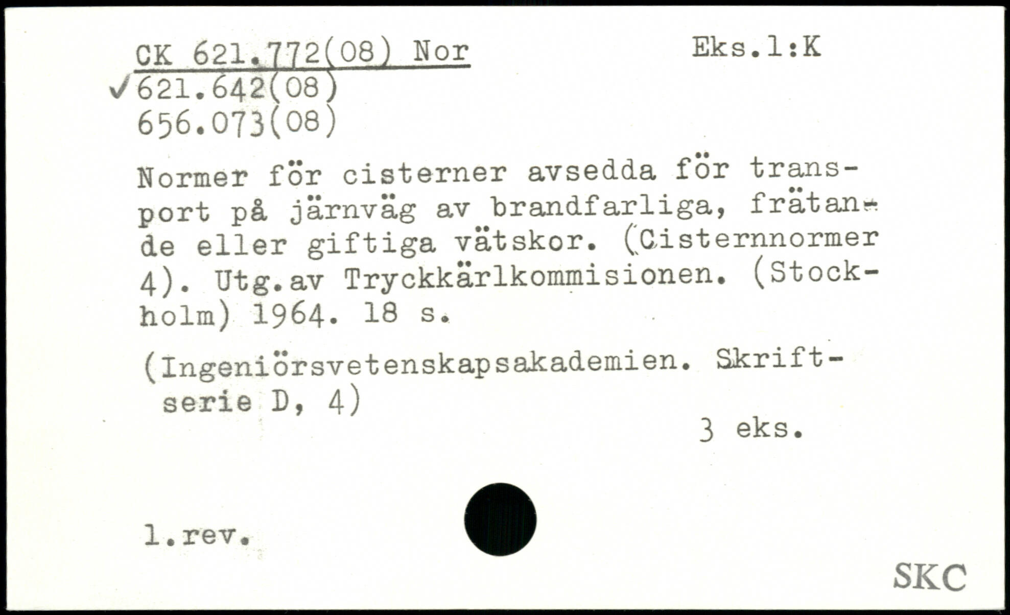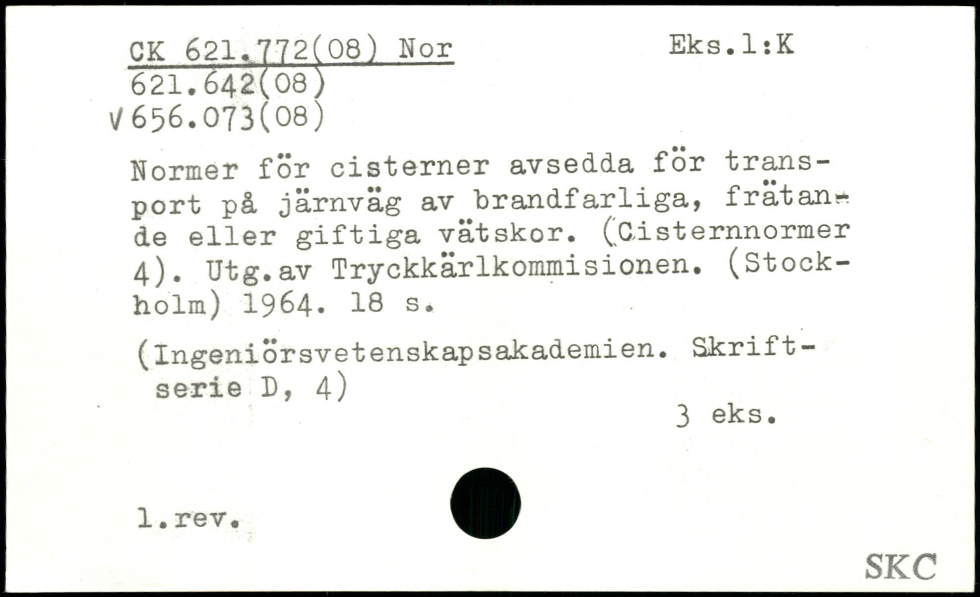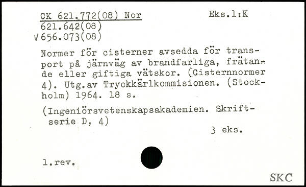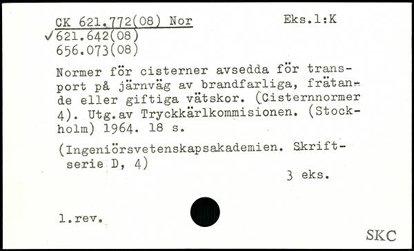Normer för cisterner avsedda för transport på järnväg av brandfarliga, frätande eller giftiga vätskor. (Cisternnormer 4). Utg.av Tryckkärlkommisionen. (Stockholm) 1964.