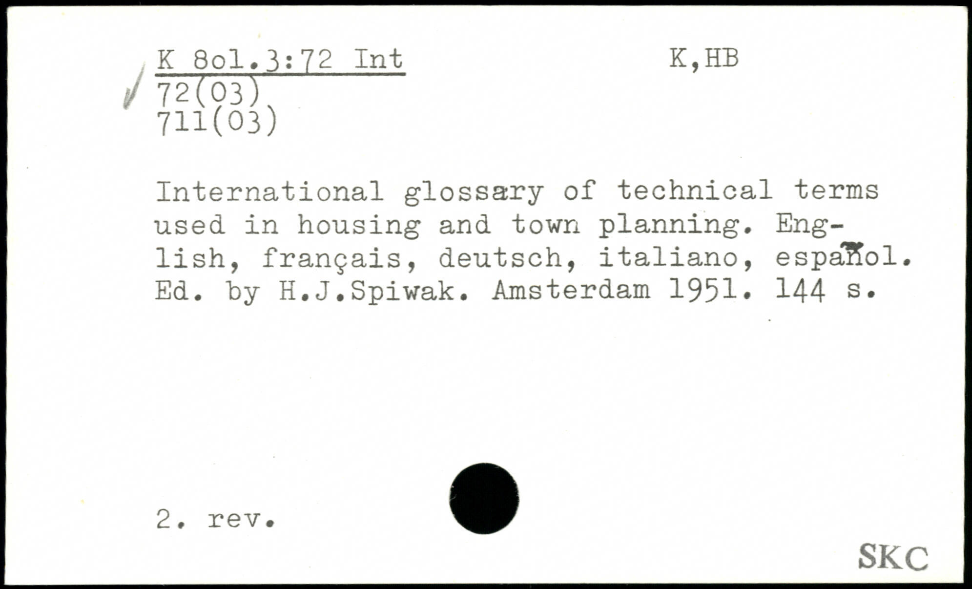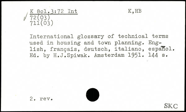 International glossary of technical terms used in housing and town planning. English, français, deutsch, italiano, espaîîol. Ed. by H.J.Spiwak. Amsterdam 1951.