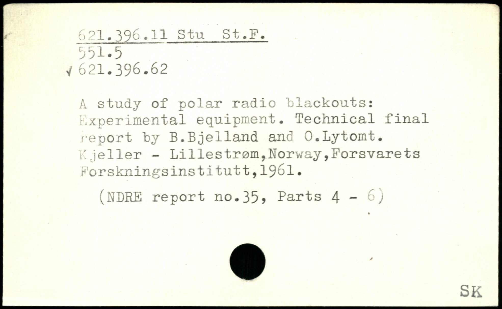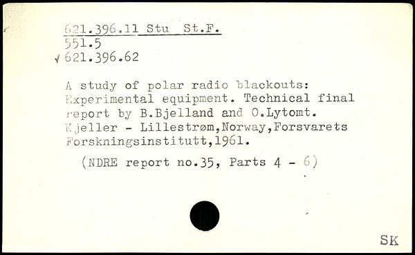 A study of polar radio blackouts: Experimental equipment. Technical final report by B.Bjelland and O.Lytomt. K.jeller -