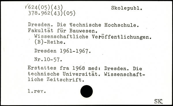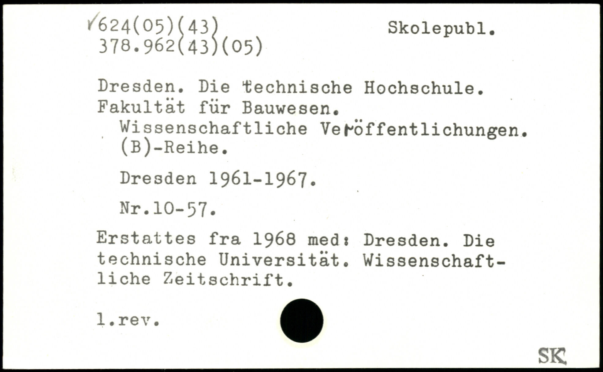 Dresden. Die technische Hochschule. Fakultät für Bauwesen. Wissenschaftliche Veröffentlichungen. (B)-Reihe. Dresden 1961-1967. Nr.10-57. Erstattes fra 1968 med. Dresden. Die technische Universität. Wissenschaftliche Zeitschrift.