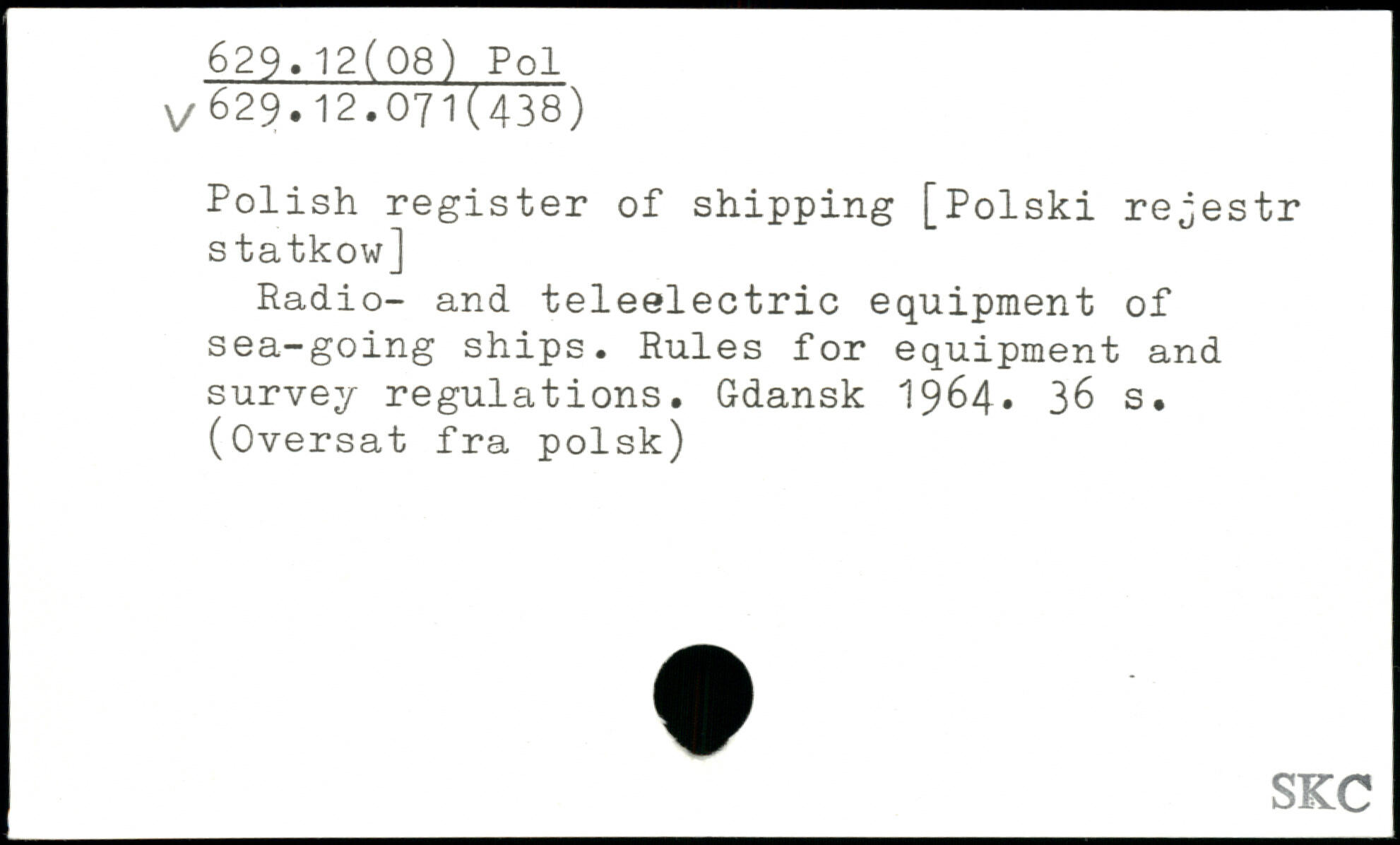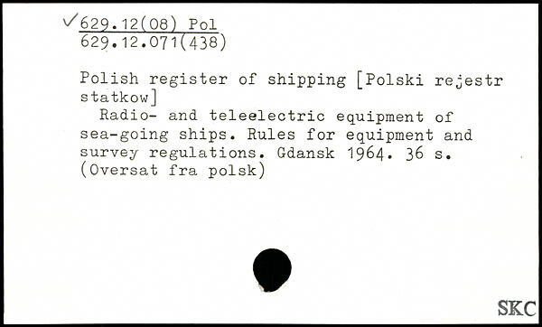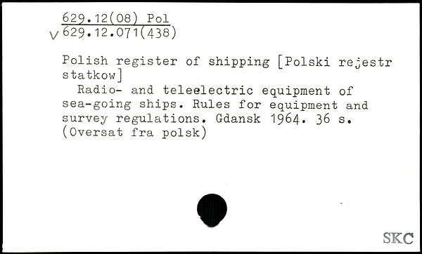 Polish register of shipping [Polski re^estr statkow] Radio- and teleelectric equipment of sea-going ships. Rules for equipment and survey regulations. Gdansk 1964.