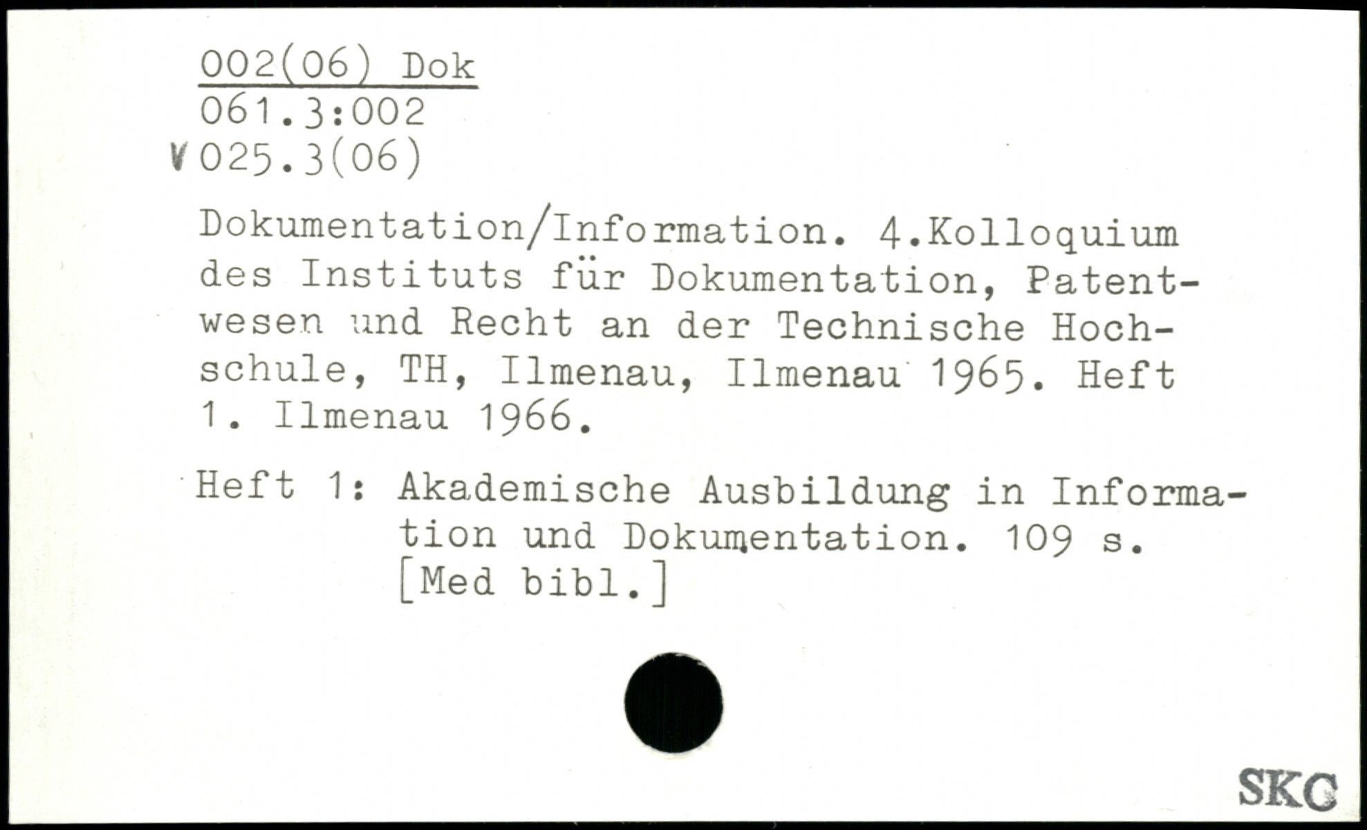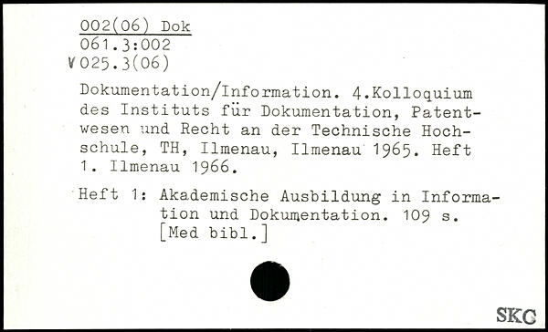 Dokumentation/lnformation. 4.Kolloquium des Instituts fur Dokumentation, Patentwesen und Recht an der Technische Hochschule, TH, Ilmenau, Ilmenau 1965. Heft 1. Ilmenau 1966. Heft 1: Akademische Ausbildung in Information und Dokumentation.
